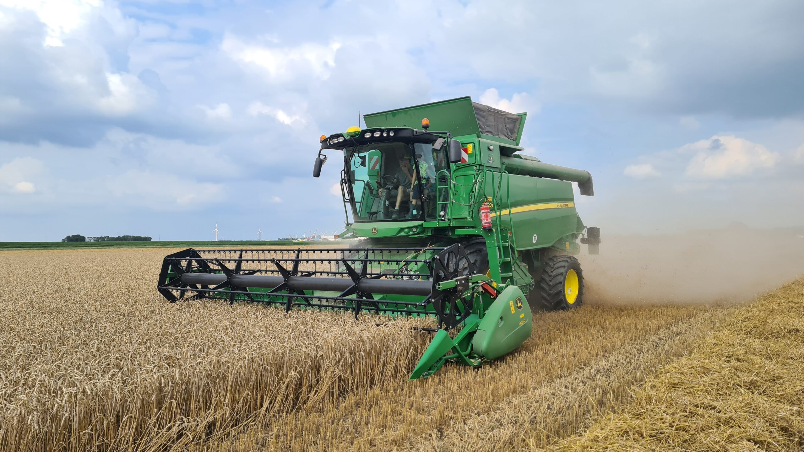 Begin augustus is het tijd om het graan te oogsten, dit doen wij vanaf 2023 met onze John Deere T550i maaidorser.